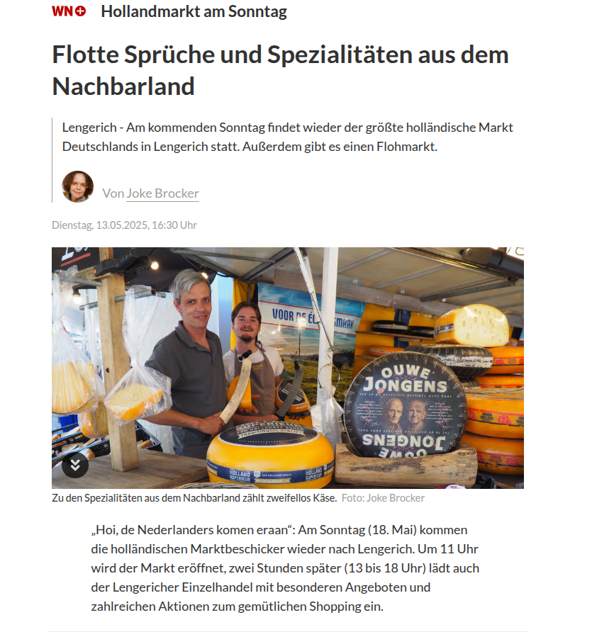 Großer Hollandmarkt mit Blasmusik!!! Genießen Sie das große Angebot an 32 Ständen auf jeweils 6 – 20 Metern!!!